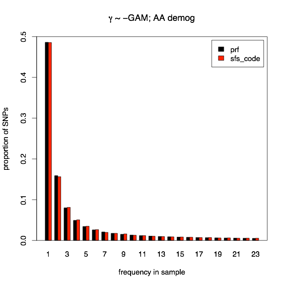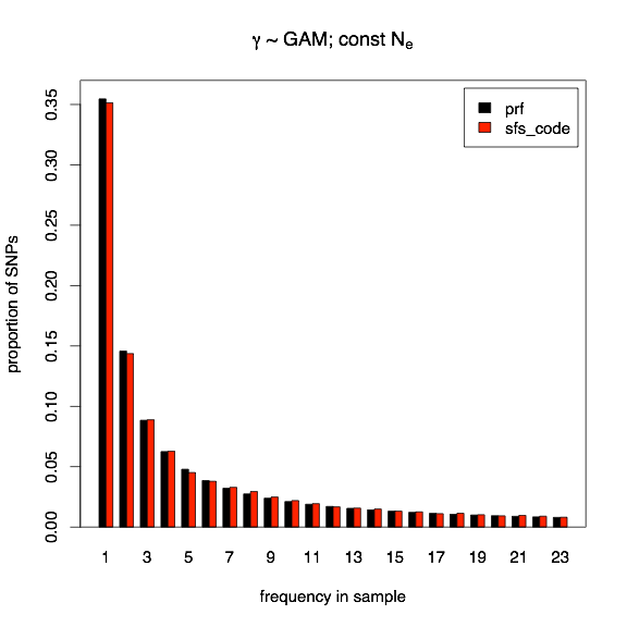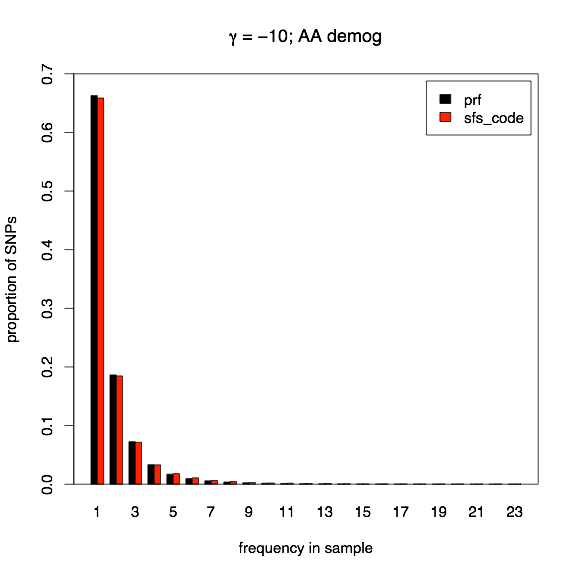The model of population growth evaluated here corresponds to the demographic history inferred for African Americans in Boyko, et al., 2008, and corresponds to a 3.3-fold expansion 0.44×2N generations ago. The two models of selection that I will consider here are both models of deleterious effects. First, all mutations will have a constant selection coefficient of γ = -10 in the current population (-3.03 in the ancestral population), and second, all mutations have an independent selection coefficient drawn from the same Gamma distribution described above (correcting for the change in population size, of course). Again, red bars indicate SFS_CODE, and black bars indicate PRF expectations.