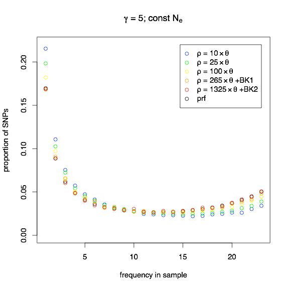 The first example (γ = 5 for all mutations) was chosen to be an extreme example of where theory can be far, far away from what might be observed. In the following figure, I show in black the normalized site-frequency spectrum (SFS) expected under the Poisson Random Field (PRF) model, and in blue, green, yellow, orange, and red, I show SFS_CODE simulations with higher and higher recombination rates (BRK1 indicates subdividing the simulated sequence into 10 equal segments with 100kb spacing, and BRK2 indicates simulating 20 equal segments with 100kb). As you can see, even when ρ= 10×θ, the observed SFS can be quite different from the expected SFS under the PRF assumption of independence. Only in the most extreme cases of recombination do the simulations approach the PRF expectation.