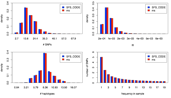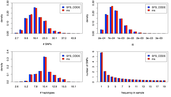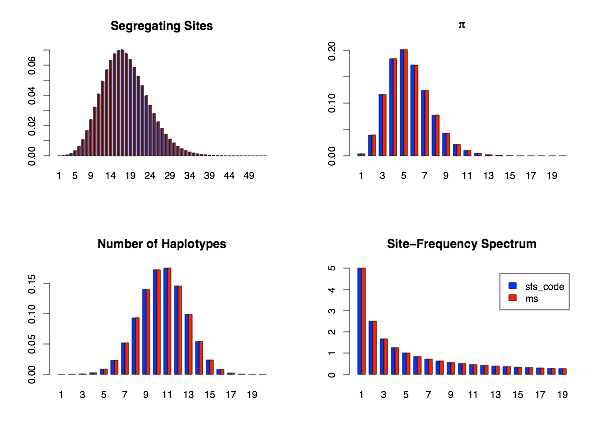 When possible, neutral models of evolution are tested by comparing patterns of variation generated by SFS_CODE to those obtained using Dick Hudson’s coalescent simulator ms under equivalent parameters. When testing the dynamics for a single population, I will focus on the following statistics: