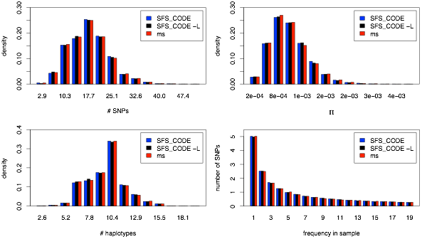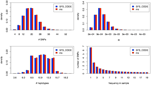 This is the simplest possible simulation to perform. First I show the distribution of the 4 statistics mentioned above for the case of no recombination (i.e., ρ = 0). Other than a slight amount of stochasticity (due to only generating 15,000 simulations), the distributions generated by SFS_CODE and ms are identical for all statistics evaluated.