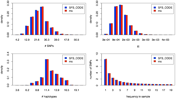 The demographic model (described in words) is as follows: The ancestral human population expanded 1.8-fold 0.63×2Na generations ago (where Na is the ancestral effective population size). Then, 0.27×2Na generations ago, the European population left Africa with an effective population size just 0.15×Na. After another 0.21×2Na generations, the European population went through another 2-fold bottleneck, but has since been recovering with exponential growth. This model has complicated dynamics, with multiple size changes, making it very useful for comparing SFS_CODE to ms. The command-lines for this demographic model are rather large, with both SFS_CODE and ms commands consuming 2 lines of text.