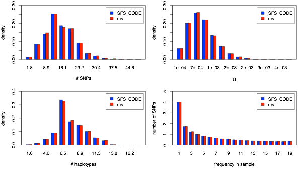 As with the 1-population comparisons, I will look at the distribution of the number of SNPs, π, number of haplotypes, and site-frequency spectrum in each population, but I will also look at the joint frequency spectrum. These statistics will allow me to show that divergence times and migration rates are all scaled properly.