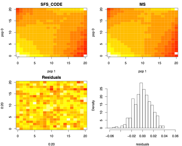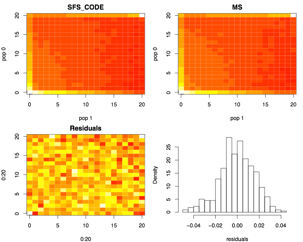 Next I show the joint site-frequency spectra. The top two panels show the number of SNPs (colored using a heat-map) at frequency (i,j), indicating that i chromosomes from the YRI sample and j chromosomes from the CEU sample carry the mutation (0 ≤ i,j ≤ 20). The lower left panel shows the distribution of the residuals (SFS_CODEi,j - msi,j)/sqrt(SFS_CODEi,j). The lower right panel shows the distribution of residuals. Note that they are centered about zero, which largely indicates that the two programs are generating equivalent results. Note that slight color differences in the two upper panels indicated slightly different cutoffs used by the image function in the R statistical package.